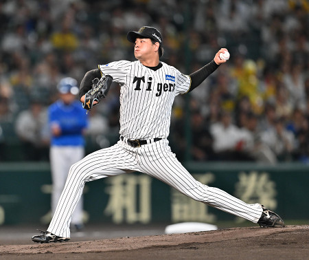 阪神が零封勝ち。1回に佐藤輝の3ランで先制。3回は大山の適時二塁打で加点した。高橋(写真)は制球良く投げ、8回途中まで無四球で3安打に抑えた。石井、岩崎とつないで逃げ切った=17日、甲子園 【時事通信社】