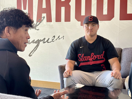 プロ野球ソフトバンクの城島健司CBO(左)らが4日、米カリフォルニア州のスタンフォード大学を訪れ、ドラフト1位で指名した同大学の佐々木麟太郎内野手にあいさつした=福岡ソフトバンクホークス提供 【時事通信社】