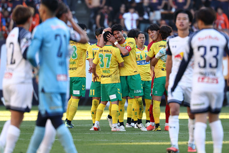JリーグのJ1昇格プレーオフは7日、準決勝が行われ、J2で3位の千葉と4位の徳島が決勝に進んだ。5位の磐田と6位の大宮は敗退。決勝は13日に千葉のホームで行われる。写真は喜ぶ千葉イレブン=フクアリ 【時事通信社】