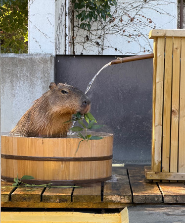 埼玉県狭山市の智光山公園こども動物園で、カピバラが露天風呂を楽しむ冬の恒例イベント「カピバラ温泉」が始まった。まったりと打たせ湯を楽しむカピバラの姿に、来園した親子連れから歓声が上がった=10日 【時事通信社】