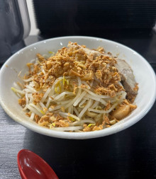 メニューは、「豚ラーメン小盛」(50グラム~200グラム=1,100円)、「並盛」(250グラム~300グラム=1,200円)、「大盛」(350グラム~400グラム=1,300円)、「汁なしラーメン」には、フライドオニオンがトッピングされる。ニンニク、野菜、脂の加減はオーダー可能。ドリンクは、「生ビール」(550円)、「瓶ビール」(650円)、「サワー」「ハイボール」(以上450円)、「ソフトドリンク」(300円)を用意。