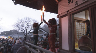 稲美町の高薗寺(稲美町野寺)で2月7日・8日、2体の鬼が火のついたたいまつを投げ入れる伝統行事「鬼追式」が行われた。