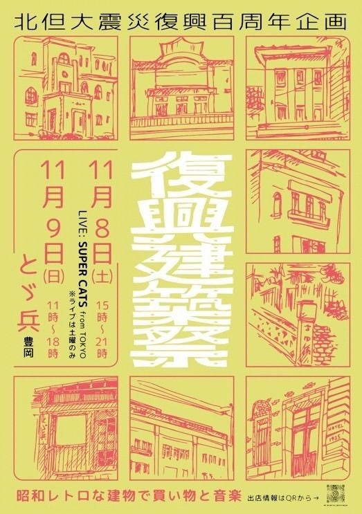 北但大震災から100年のこの年に、当時建てられた復興建築群の今とこれからの活用をテーマに、建物の魅力×エンタメの遊び要素満載のイベントとなります。豊岡にゆかりのある昭和レトロな建物を会場に買い物や音楽などを楽しむ参加型のイベントを通して、まちの遺産でもある復興建築群を巡ってもらえる企画。