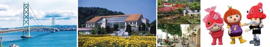 画像左から■明石海峡大橋■オアシス館■花の谷とアトリウム■公認ゆるキャラ「たい坊やん」「淡路タマ子さん」「オクトパス将軍」