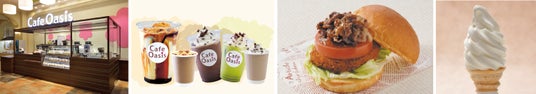 画像左から■カフェオアシス店舗■各種Richシリーズドリンク■オアシスバーガー■淡路島牛乳匠ミルクソフト