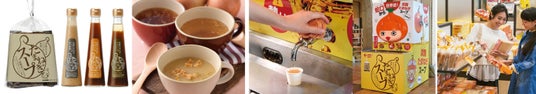画像左から■淡路たまねぎスーププレーン■淡路たまねぎドレッシング■たまねぎスープ各種イメージ■たまねぎスープスタンド(蛇口からたまねぎスープ)■物産館でのお買い物イメージ画像
