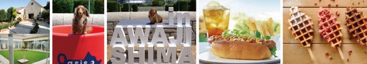 写真左から■ドッグカフェ外観と店内ドッグラン■フォトスポット(1)コーヒーカップ■フォトスポット(2)AWAJISHIMA■淡路島ホットドッグセット■クロッフルスティック