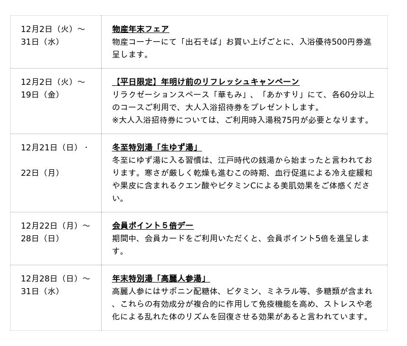 冬至には、美肌効果が期待される特別湯「生ゆず湯」をご用意。江戸時代から続く“冬至のゆず湯”の習わしを、温泉でゆったりと体験いただけます。皆さまのご来館を心よりお待ちしております。